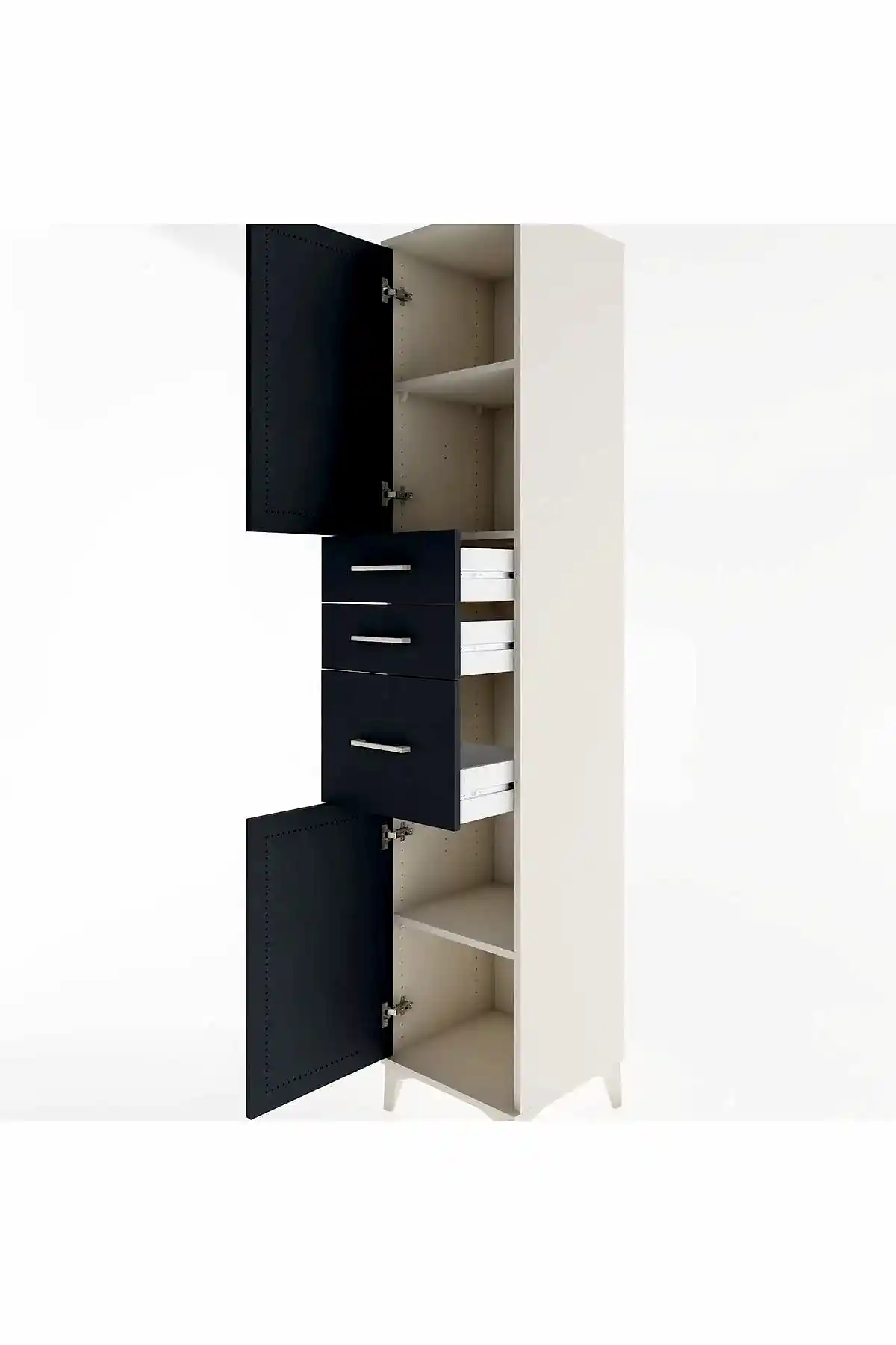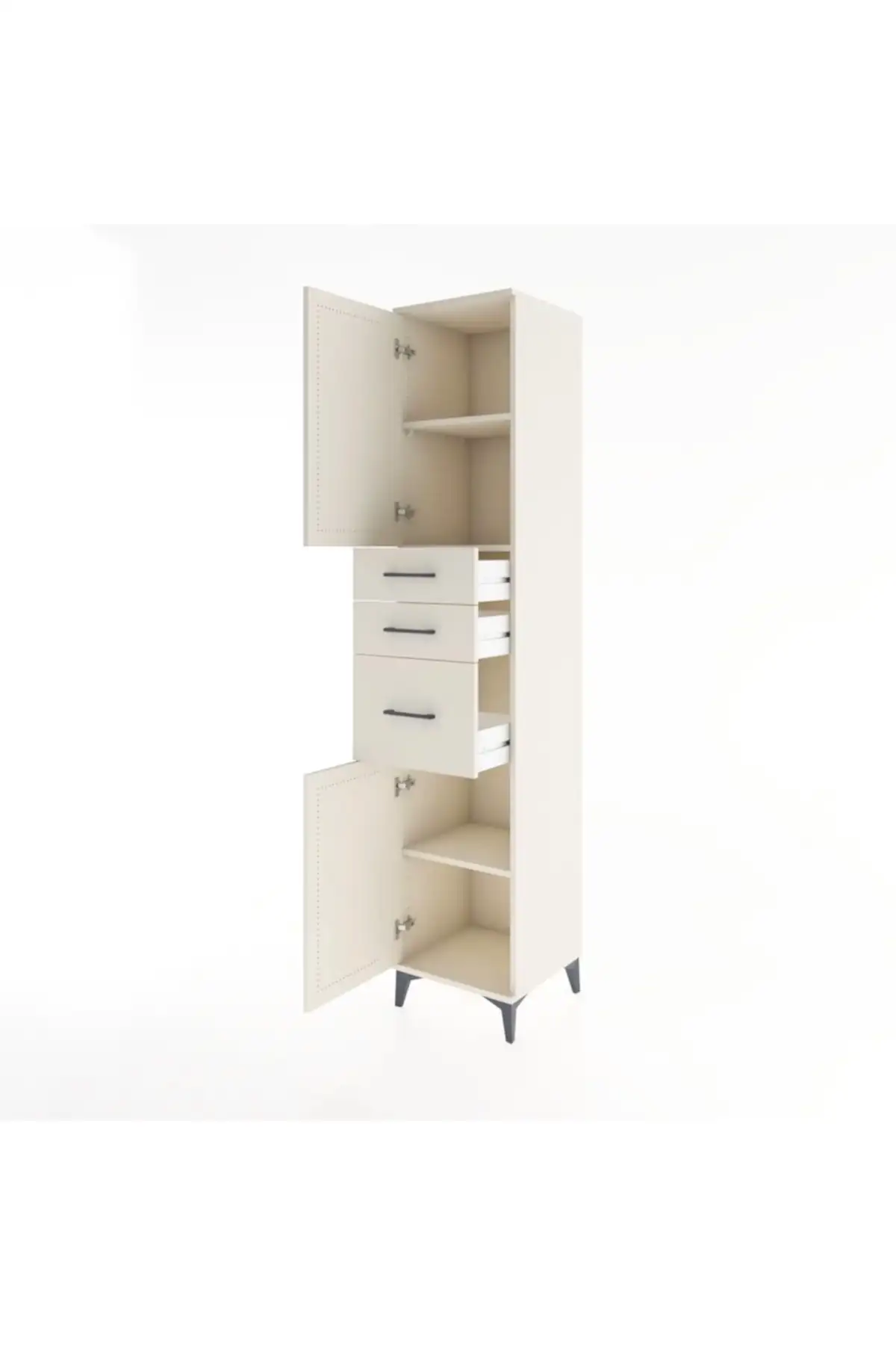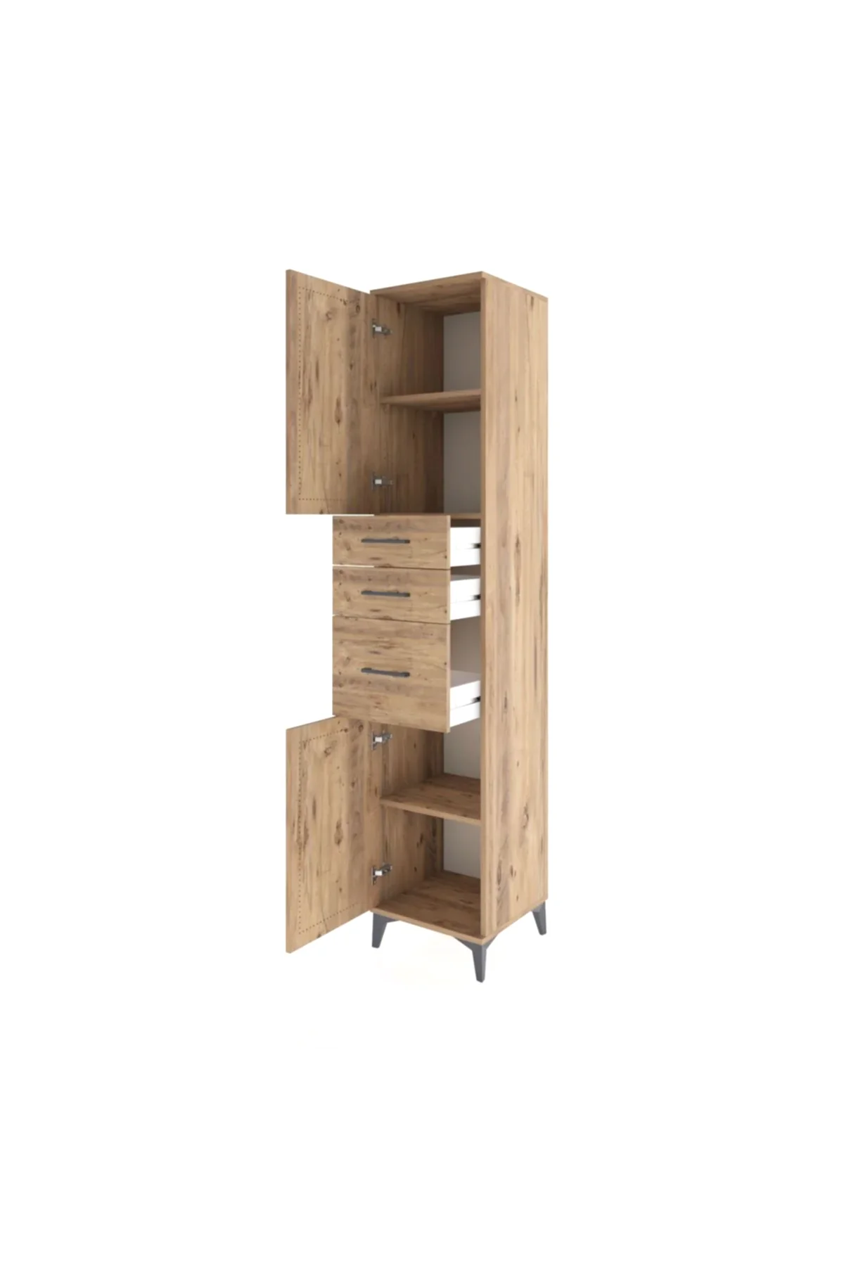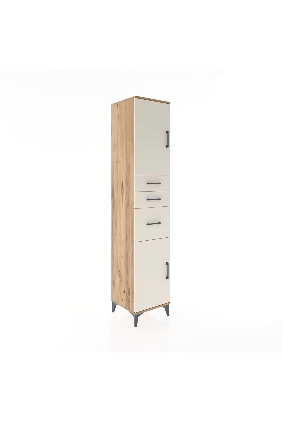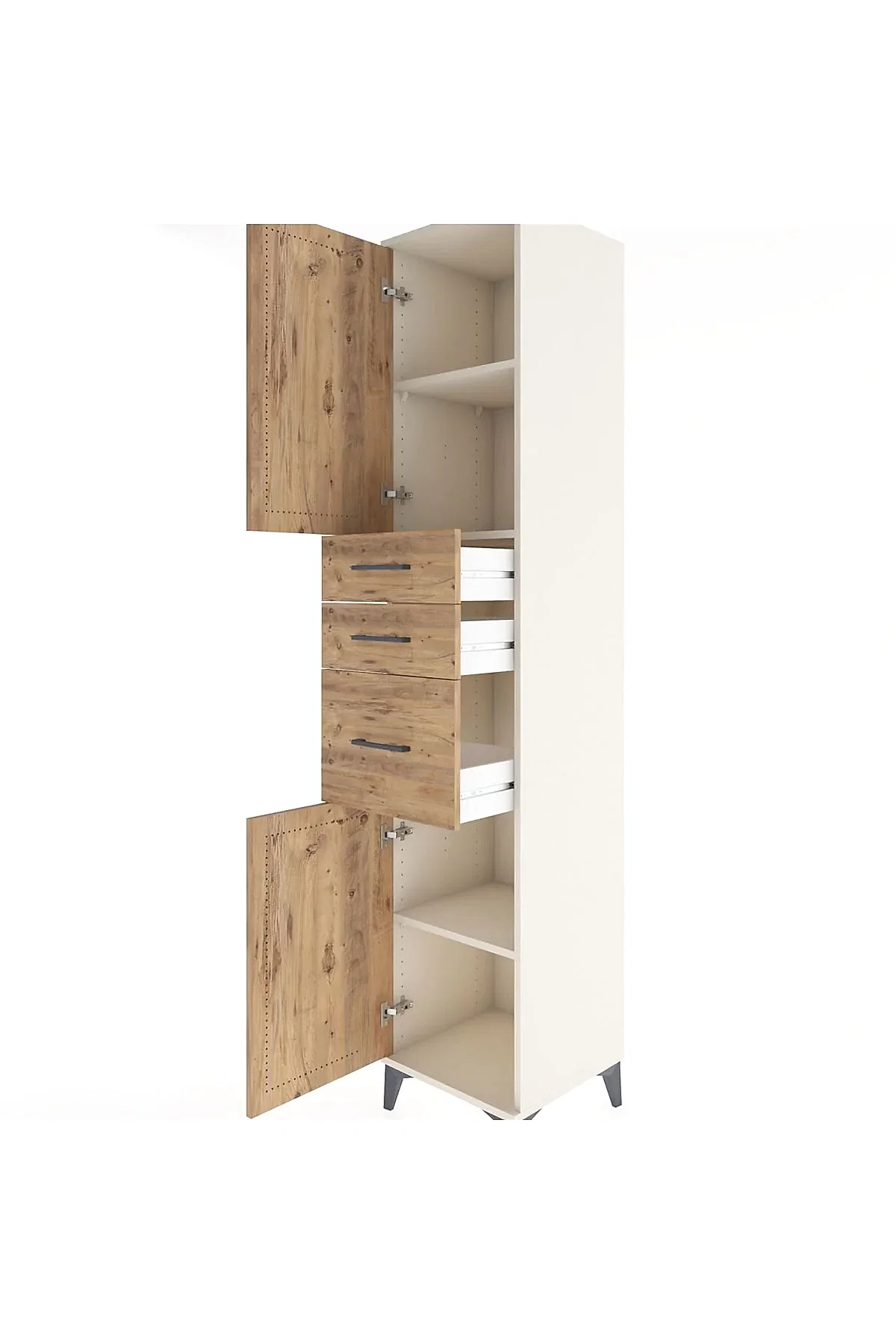 🦾 Metal ayaklar, dolaba modern bir hava katarken, zeminden yüksekliği sayesinde temizliği kolaylaştırır. Metal kulplar, dolabın şık tasarımını tamamlar ve kullanım kolaylığı sunar.