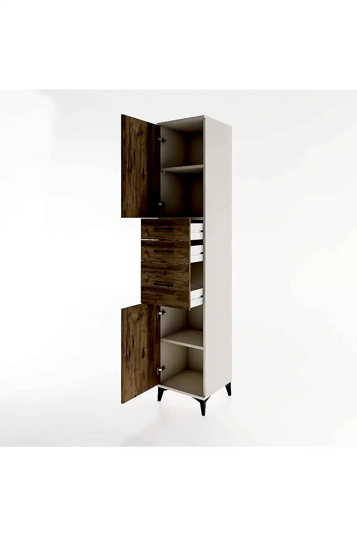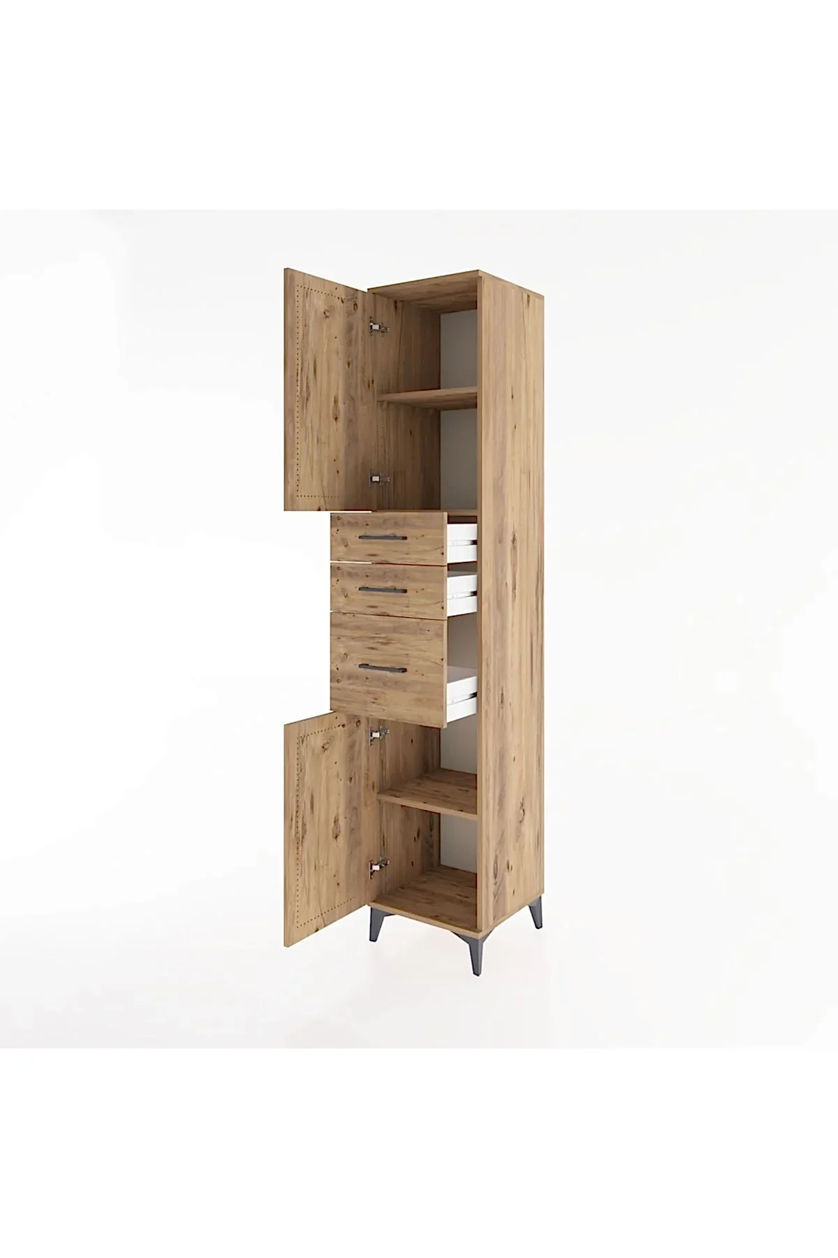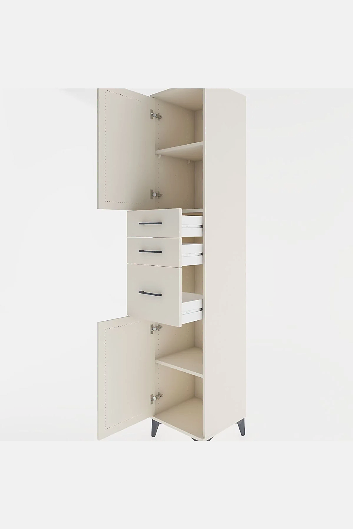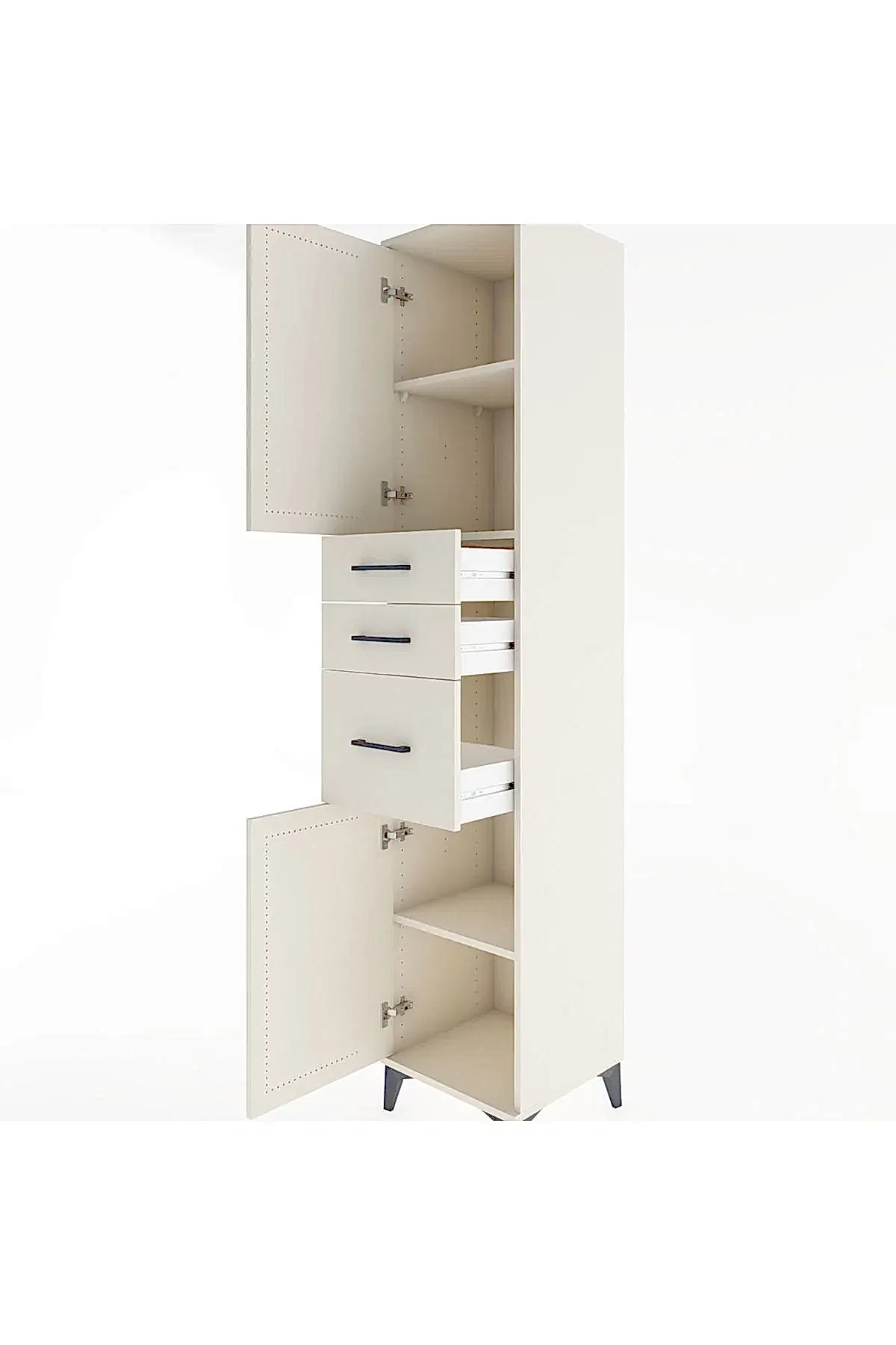 🦾 Metal ayaklar, dolaba modern bir hava katarken, zeminden yüksekliği sayesinde temizliği kolaylaştırır. Metal kulplar, dolabın şık tasarımını tamamlar ve kullanım kolaylığı sunar.