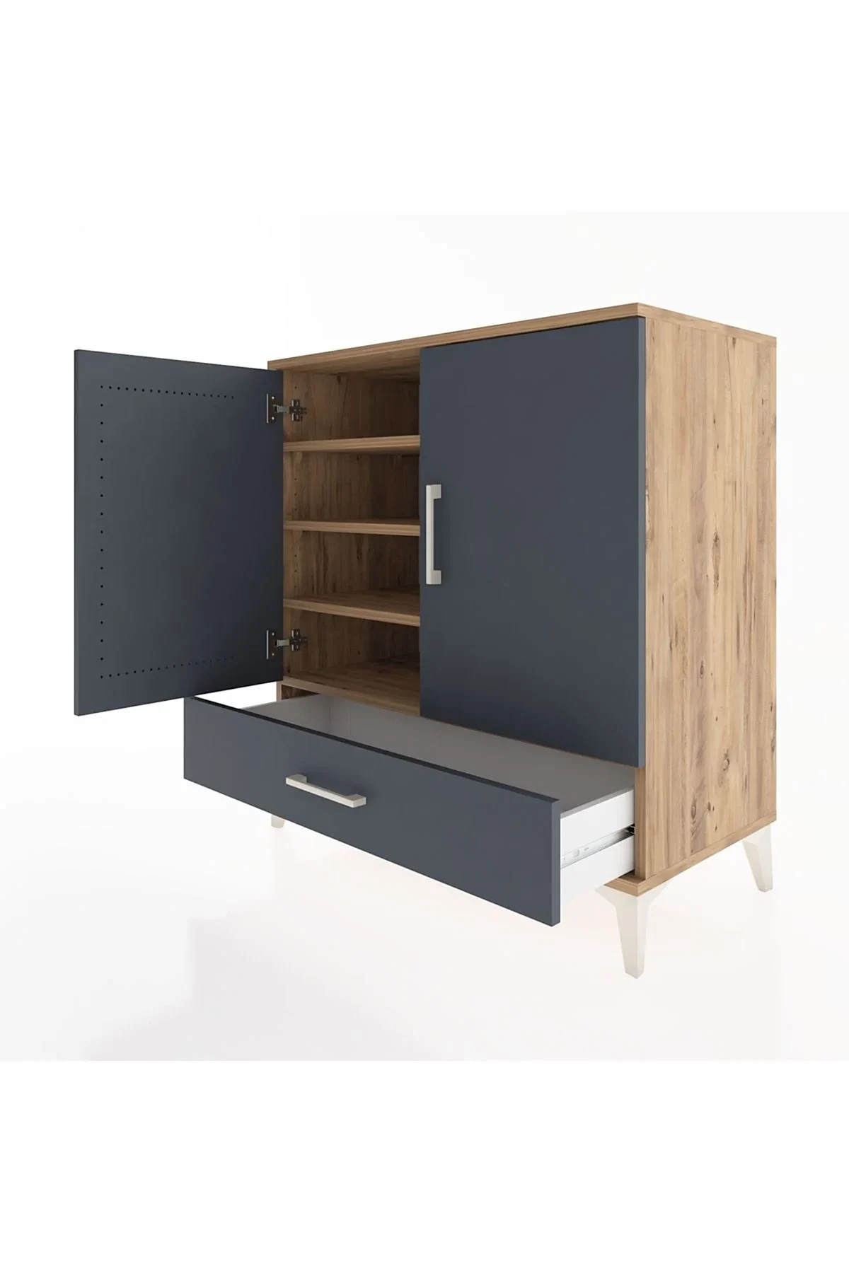 🦾 Şifonyerin ayakları ve kulpları metalden üretilmiştir. Metal ayaklar, şifonyere modern bir görünüm kazandırırken, aynı zamanda sağlam bir temel oluşturur. Metal kulplar ise şifonyerin kapaklarını ve çekmecesini kolayca açıp kapatmanızı sağlar.